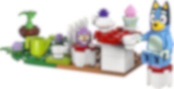 Häng med Bluey och Tjattermax på en mysig tebjudning på verandan! Blueys tebjudning (30687) inkluderar figurer av Bluey och Tjattermax, en tekanna, koppar, en cupcake och en stol formad som en röd svamp. Ett gulligt litet set för fans av den populära tv-serien Bluey, från 4 år.