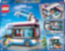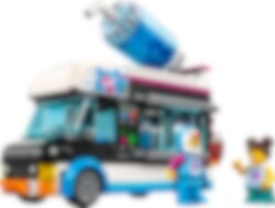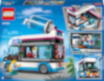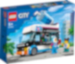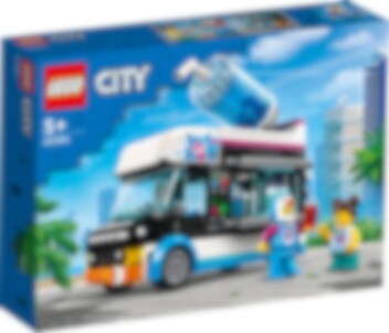 Hurra! Slushbilen med pingvin har kommit till LEGO® City. Denna kioskbil med kalla drycker är riktigt cool! Kolla in den iögonfallande pingvindesignen! Ha roligt med försäljaren i pingvindräkt i beredningsdelen. Skjut luckan åt sidan för att servera kalla drycker i 4 fruktsmaker till törstiga kunder. Sätt dig sedan bakom ratten och kör till nästa plats!