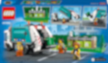 Piip ... Piip ... Piip! LEGO® City Återvinningsbil har kommit fram till återvinningscentralen. Hjälp arbetarna att lasta upp behållarna på den tippbara plattformen och vrid hjulet för att tömma ut innehållet i den bakre delen av bilen. Se upp! Akta den där nyfikna katten! När du är färdig kan du köra tillbaka till basen och höja flaket för att tippa av innehållet. Vem anade att det kunde vara så roligt att återvinna avfall!