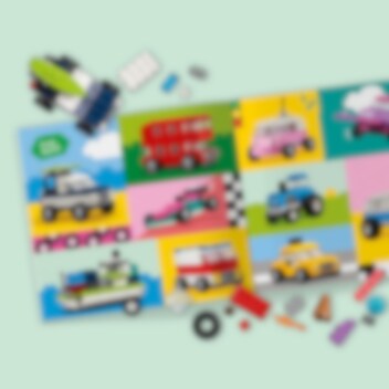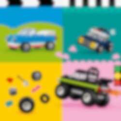 Spänn fast dig och sätt fart på det roliga med den coolaste samlingen anpassningsbara LEGO® fordon! Bygg en polisbil, en glassbil, en fyrhjuling, en frontlastare, en lastbil, en limousin, ett terrängfordon och en kombi. Använd färgglada klossar, specialdelar och över 50 hjul för att anpassa ditt fordon. Upptäck 10 idéer för att göra dina bilar ännu grymmare!