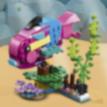 Ge dig ut i regnskogen för roliga äventyr med 3 exotiska djur! Du kan bygga en vacker exotisk rosa papegoja som sitter på en trädgren omgiven av färgglada blommor. Bygg sedan om den till en klarrosa och blå fisk som simmar i havet eller en färgglad groda som kan röra på benen. De detaljerade och rörliga modellerna i detta 3-i-1-lekset garanterar timmar av skoj.