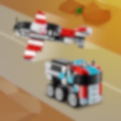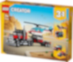 Titta upp i himlen! En helikopter är på väg att landa på ett lastbilsflak. När den har landat kan LEGO® Creator Flakbil med helikopter byggas om till ett kraftfullt propellerplan med en tankbil eller en hotrod med en suv för spännande tävlingar. Du kan även växla upp fantasin och skapa helt egna fordon. Med detta 3-i-1-fordonsset tar all action aldrig slut!