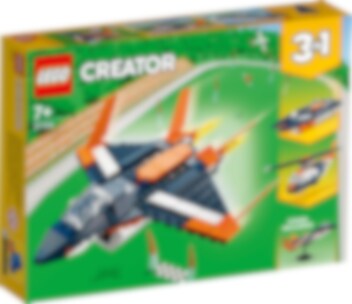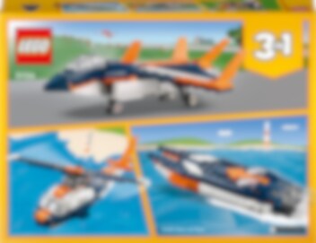 Upplev fantastiska äventyr högt uppe i luften eller på vattnet! Sätt dig bakom spakarna på det otroliga överljudsjetplanet för att utföra våghalsiga trick i luften. Väl nere på marken kan du bygga om jetplanet till en helikopter med roterande blad och flyga upp i luften igen, eller till en motorbåt för fartfyllt skoj på vattnet. Det finns oändliga möjligheter med detta 3-i-1-set.