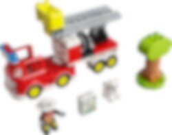 En katt sitter fast längst upp i ett högt träd! Brandbilen rusar till platsen med blinkande ljus och sirenen på. Din lilla hjälte kan knuffa och vrida bilens spak för att höja stegen och rotera korgen. Om den stackars kissen inte törs röra på sig finns det lite godsaker för att locka ner den. Och om inte det heller fungerar är det dags att dra ut vattenslangen!