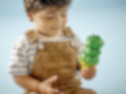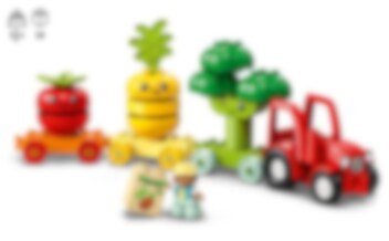 LEGO® DUPLO® Min första frukt- och grönsakstraktor (10982) erbjuder massor av roliga sätt att utveckla små barns lärande. Förskolebarn följer med bonden när han skördar frukt och grönsaker med den körbara traktorn och 3 släp. Barn från 18 månader kan finslipa sin finmotorik samtidigt som de lär sig hur frukt och grönsaker gror och genom att stapla klossarna för att få växterna att "växa". De kan även ha roligt med sortering - förskolebarn kan matcha grödan med släpets färg eller använda sin kreativitet och sitt självuttryck och blanda färgerna eller byta ut ansiktena! Pedagogiska leksaker som gör inlärning roligt Alla LEGO DUPLO leksaker är smart utformade med roliga berättelser, klara färger, engagerande karaktärer och massor av detaljer för att utveckla tidiga färdigheter hos små barn. Detta set kan kombineras med de andra lekseten i serien Min första ekologiska och alla andra LEGO DUPLO modeller.