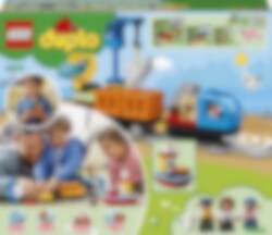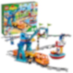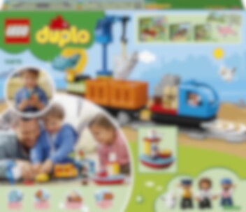 LEGO® DUPLO® Godståg är nu ännu enklare för ditt barn att kontrollera och interagera med på olika sätt. Små barn kan bli lokförare med knuffa och kör-motorn - en lätt knuff antingen bakåt eller framåt får tåget att rulla, medan ett fast grepp eller lyft får det att stanna. Hjälp dem att placera de 5 actionklossarna i olika färger på spåret för att tuta, tända och släcka lamporna, stanna och tanka, byta riktning och stanna tåget var de vill. Förskolebarn kan njuta av klassiskt tågskoj med hamnen, båten, kaféet, laststationen, 2 kranar, 3 DUPLO figurer, djurfiguren och alla coola spårdelar som ingår i detta LEGO DUPLO set. Ladda ner den valfria appen för att låsa upp ännu fler lekmöjligheter, inklusive fjärrkontrollsfunktion och roliga aktiviteter att utföra med ditt barn!