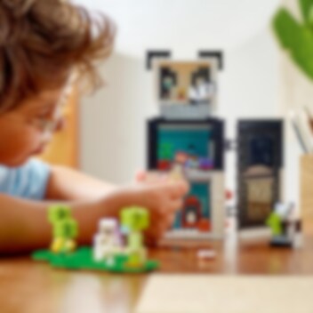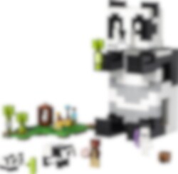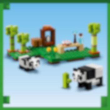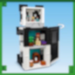 Om du gillar Minecraft® pandor kommer du att älska detta pandahus med 3 våningar! Öppna baksidan för att kolla in de olika rummen, vart och ett fullt av coola tillbehör för kreativa lekar. Känner du för något nytt? Bygg om ditt pandahus så att det sitter eller står upp på alla 4 ben! Gå ut i bambudjungeln med en utforskare. Mata en panda och en pandaunge med tårta - men håll utkik efter skelettet med armborst!