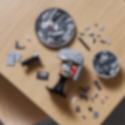 Det är dags att hylla den legendariske prisjägaren The Mandalorian. Hitta ditt fokus och bygg en elegant LEGO® Star Wars version av hans ikoniska hjälm. Använd de silverlackade LEGO delarna för att återskapa den metalliska beskarglansen. Sätt ihop klossar i olika toner av grått för att ta fram hjälmens konturer. Visa sedan upp det imponerande bytet från ditt kreativa uppdrag på det medföljande stället med namnskylt.