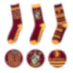 3 par strumpor i färgerna röd och gul och med fräckt Gryffindor motiv från Harry Potter. En kul present till den som är en Harry Potter fantast.