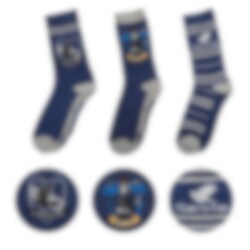 3 par strumpor i färgerna blå och grå och med vackert Ravenclaw motiv från Harry Potter. En fin present till den som är en Harry Potter fantast.