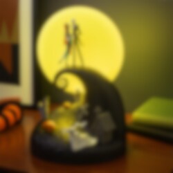 Diorama-lampan föreställer Jack och Sally i den ikoniska scenen framför månen, med detaljer som Zero och pumpor i förgrunden. Lampan är 30 cm hög och sprider ett mjukt ljus som skapar rätt atmosfär, perfekt som samlarobjekt eller dekoration för fans av Tim Burtons klassiker.