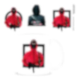 Fin porslinsmugg i vit färg med motiv av Front Man och två vakter från den läskiga serien Squid Game.