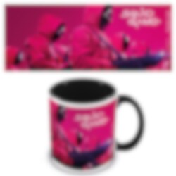 Superläcker porslinsmugg med svart handtag och insida och med motiv av de läskiga maskerade vakterna från den populära Netflix serien Squid Game. En kul sak att addera till mugg samlingen eller ge bort som present till den som älskar Squid Game.