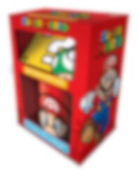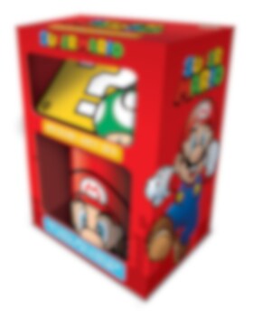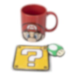Roligt presentkit innehållande en porslinsmugg, ett glasunderlägg och en nyckelring med motiv av en 1-up svamp från Super Mario. En skoj present till den som älskar Super Mario.