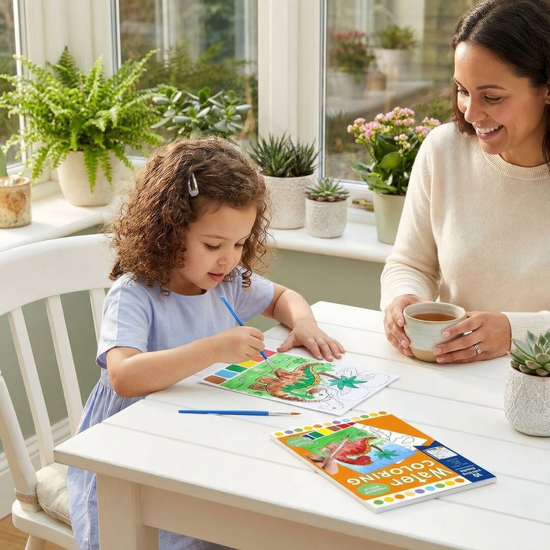 Dinosaurie målarbok med vattenfärger är ett roligt och kreativt set där barnen målar med endast vatten. Doppa den medföljande penseln i vatten och färglägg de olika dinosauriemotiven direkt på arken. Perfekt som lugn kalasaktivitet eller som present till små dinosauriefans.