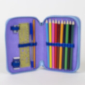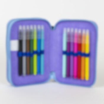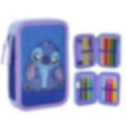 Förvandla dina kreativa stunder med detta dubbla pennfodral med ett charmigt Stitch-motiv. Setet innehåller färgpennor, tuschpennor, linjal, suddgummi, bläckpenna, blyertspenna och pennvässare.