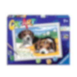 Målar set med motiv av ett par urgulliga Jack Russell valpar som passar perfekt till den unga blivande konstnären. En kreativ hobby till dem som älskar att måla och följa siffror. Detta set är till dem som är från 7 år. Tavlan är ca 18 x 24 cm stor när den är färdig.
