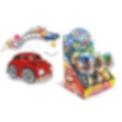 Leksaksägg som innehåller en bil och en påse med karameller med god fruktsmak. En kul pryl att ha i presentpåsen som en gåva till födelsedagsbarnet eller varför inte använda den som pinatafyllning eller innehåll till kalaspåsen. Äggen säljs styckvis och bilen finns i olika färger.