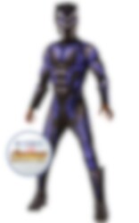 Black Panther Battlesuit Deluxe Maskeraddräkt inkluderar en vadderad jumpsuit med skoöverdrag samt en helmask av plast som efterliknar Wakandas superhjälte Black Panther från Marvel.