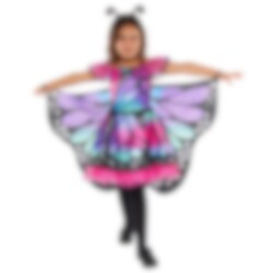 - Innehåller: Färgglad klänning i flera lager som skimrar i rosa, turkos och lila med fjärilsvingar och ett matchande hårdiadem. Skor och leggings ingår inte.