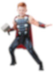 Thor maskeraddräkt deluxe inkluderar en vadderad snygg helkroppsoverall med tryck och cape. Förutom dräkten så ingår en Thors hammare i foam-material. Dräkten finns i tre storlekar som passar barn mellan 3 och 8 år. Tillverkad av 100 % Polyester. Dräkten ska handtvättas med lite vatten och dropptorkas. Skor ingår ej.
