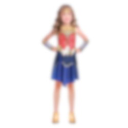 Wonder Woman Maskeraddräkt inkluderar en klänning med tillhörande bälte, en huvudbonad och ett par handskar.
