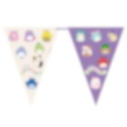 Färgglad flaggirlang av papper med motiv av karaktärerna från Squishmallows. En fin dekoration för att skapa en rolig stämning på kalaset!